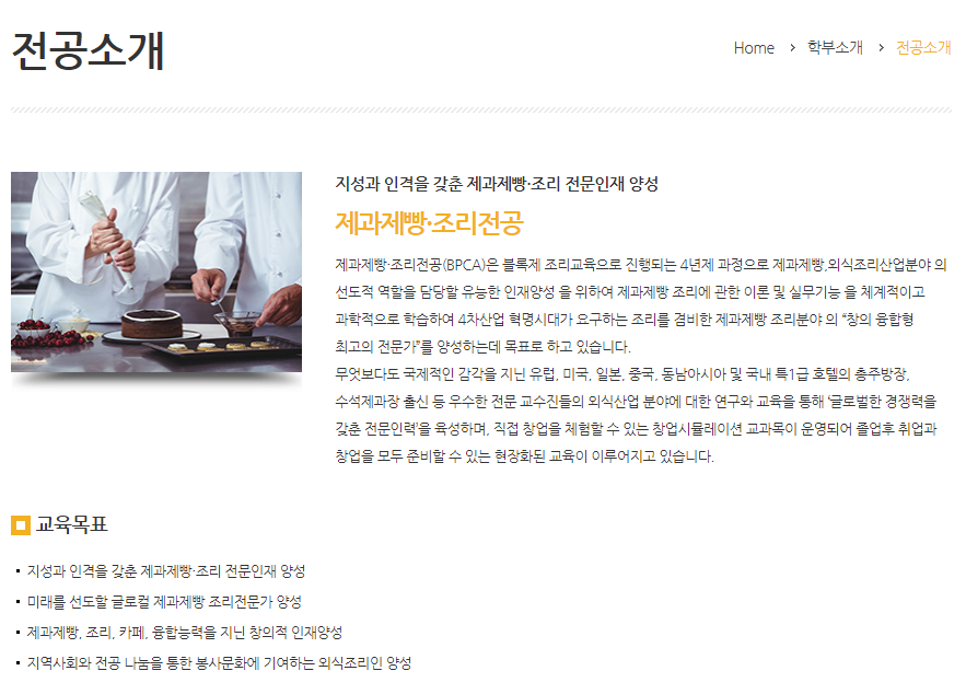 - 외식교육 분야에서 가장 먼저 제과제빵학과를 개설한 학교